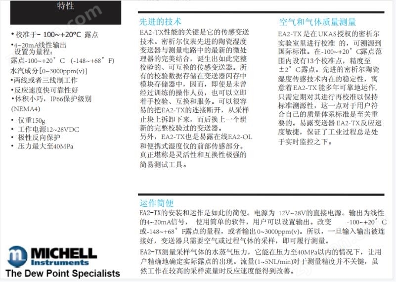 密析爾MICHELL Easidew 溫濕度變送器EA2-TX-100適用于壓縮空氣或工業(yè)過程氣體濕度的連續(xù)測量??固可靠的經(jīng)濟?? 兩線制阻抗溫濕度變送器,詢扣4614零零66